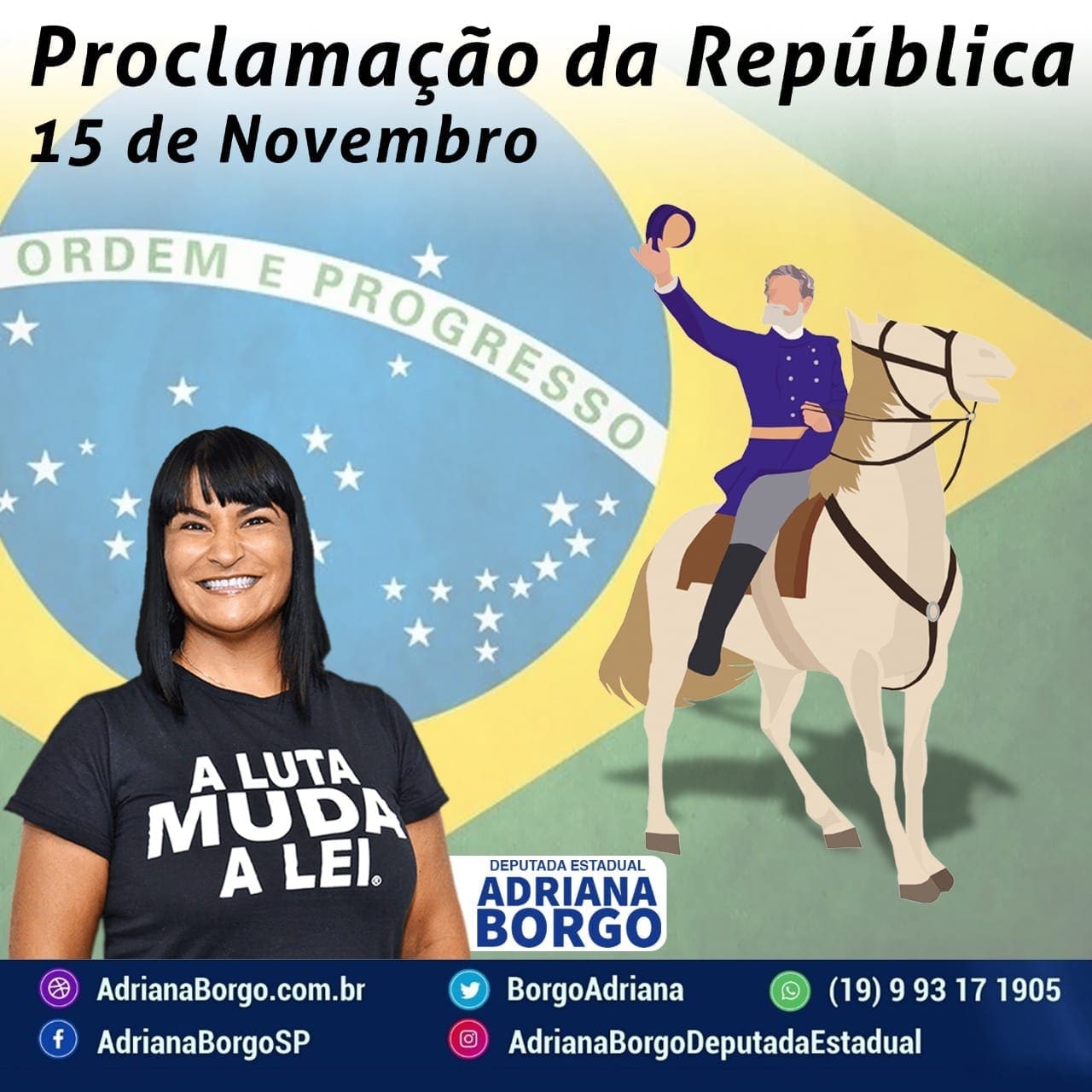 “Hoje é dia de eleições municipais no Brasil, e celebramos a Proclamação da República, evento que marca o início do período em que o povo brasileiro passou a decidir o seu próprio destino. Que hoje tenhamos consciência e sabedoria para fazer a melhor escolha para nossas cidades.” registrou a deputada Adriana Borgo, em suas redes sociais.