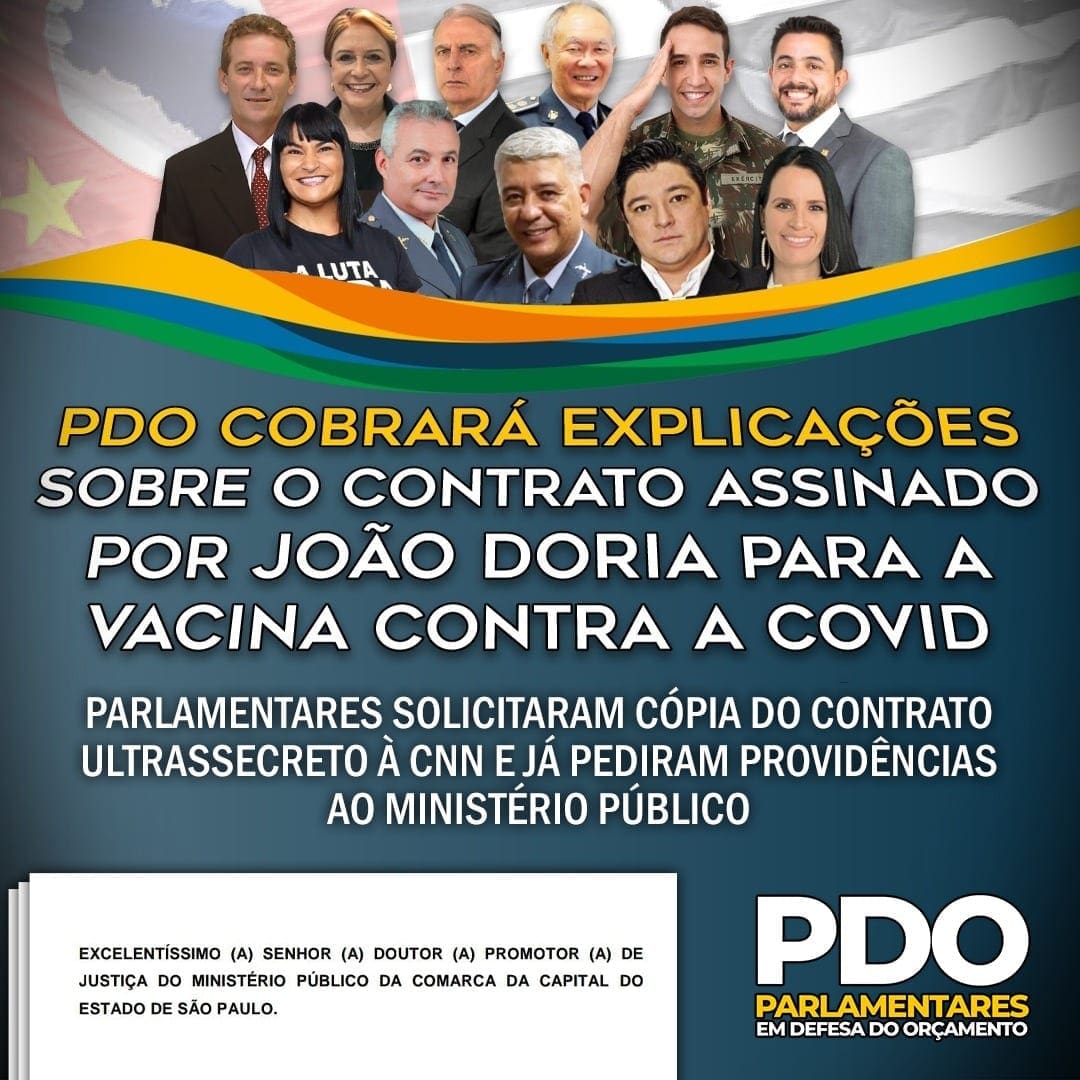 A deputada estadual Adriana Borgo, e os outros deputados que integram o grupo PDO – Parlamentares em defesa do Orçamento, cobram, através da justiça, explicações a respeito do documento assinado pelo governador Doria, que trata de questões da vacina da Covid-19 que, de acordo com informações da CNN Brasil, não estipula um valor para a aquisição de doses da CoronaVac, apenas menciona um possível preço a ser pago pela imunização.