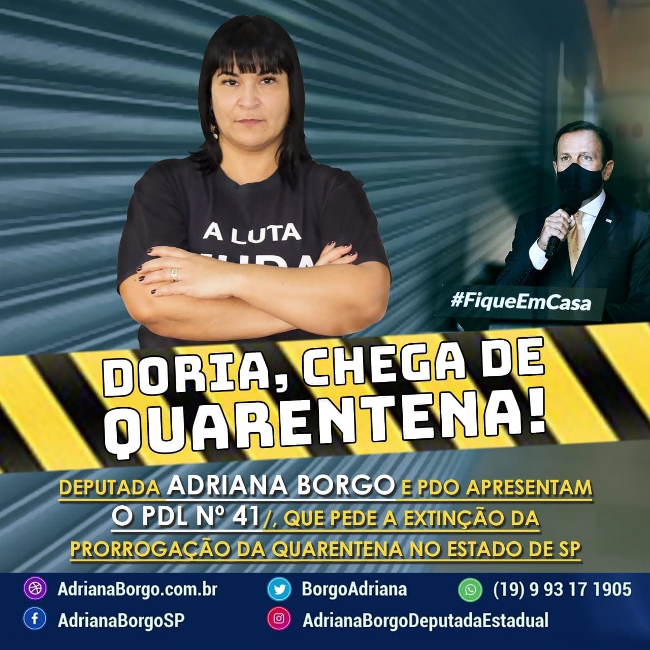 “A Quarentena representa para São Paulo, uma verdadeira farra do Governo, que instaurou o pânico, fechou o comércio, aumentou impostos e comprou itens relacionados ao combate à COVID-19 livre de licitações. Por isso, eu e os deputados do PDO apresentamos o PDL Nº 41/20, pedindo a extinção da prorrogação da Quarentena.” explica a deputada Adriana Borgo
