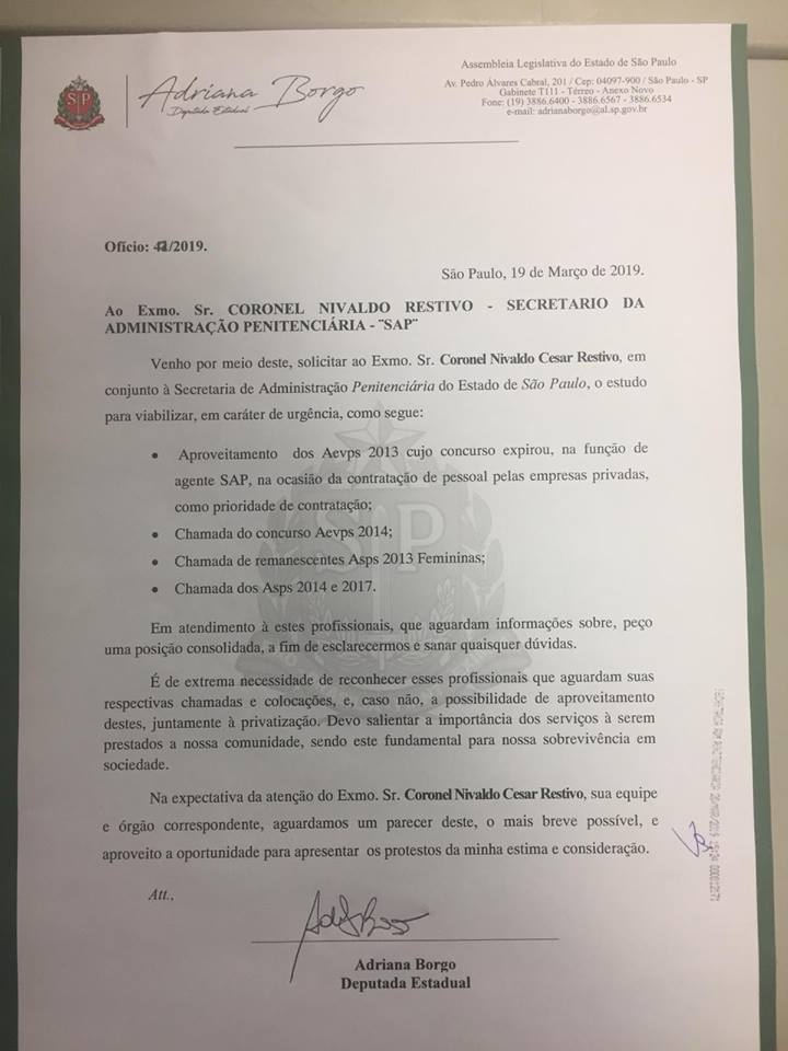 Em atendimento à demanda dos candidatos aprovados no concurso realizado em 2014 para o cargo de Agente de Escolta e Vigilância Penitenciária (AEVP), a deputada Adriana Borgo encaminhou pedido de informação ao Secretário de Administração Penitenciária, Cel. Nivaldo Restivo, questionando informações acerca do chamamento/nomeação.
