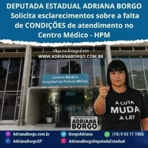 A Deputada Estadual Adriana Borgo encaminhou ao Secretário de Segurança Pública do Estado de São Paulo, Requerimento de Informações, para que o mesmo preste informações referente as condições de atendimento do Centro Médico da Polícia Militar do Estado de São Paulo – HPM.