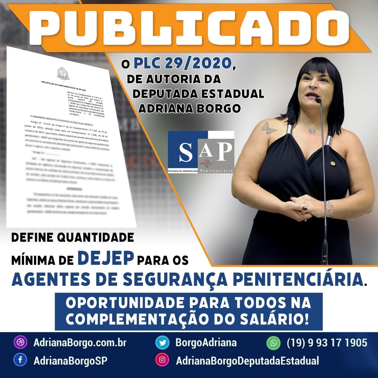 Atendendo a demanda recebida no gabinete, através dos Agentes de Segurança Penitenciária, a deputada estadual Adriana Borgo apresentou o PLC 29/2020, que determina a quantidade mínima de DEJEP – Diária Especial por Jornada de Trabalho – pelo período de 8 horas contínua, tendo os Agentes de Segurança Penitenciária direito ao mínimo de 5 e no máximo 10 jornadas por mês.